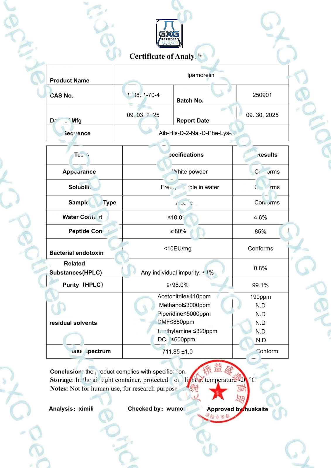 Ipamorelin is a pentapeptide and a synthetic ghrelin mimetic (acting as a ghrelin agonist) with high growth hormone (GH) releasing potency. Since it mimics ghrelin and binds to its receptors (GH secretagogues receptors) in the brain, it stimulates the release of GH in the pituitary gland; which leads to an increase in plasma GH levels, but also increased levels in GA tract, lungs, heart, liver, kidney and pancreas.