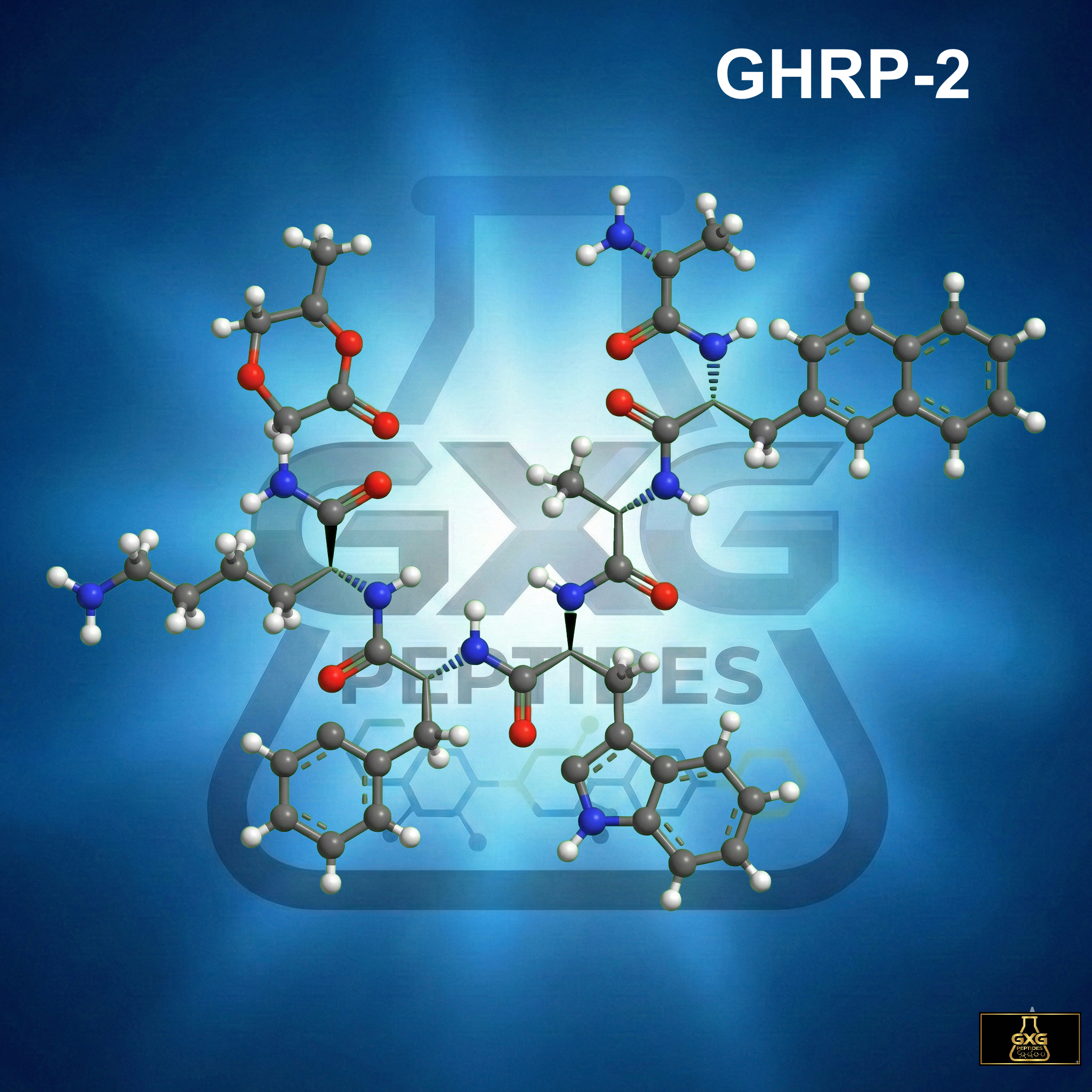 (Pralmorelin) GHRP-2 (also known as KP 102) is a synthetic hexapeptide Growth Hormone Releasing Peptide (GHRP), which acts on the hypothalamus and the pituitary gland to release growth hormone with a slight stimulator effect on Prolactin, ACTH and Cortisol levels. GHRP-2 is considered to be a true hGH secretagogue, meaning that it stimulates the body’s own secretion of hGH. Human Growth hormone has been shown in studies to promote lean body mass and reduce adiposity (fat). GHRP2 has demonstrated that it is very effective at stimulating GH production in research test subjects. It has a short half life with peak concentrations occurring around 15 minutes and not longer than 60 minutes after administration.